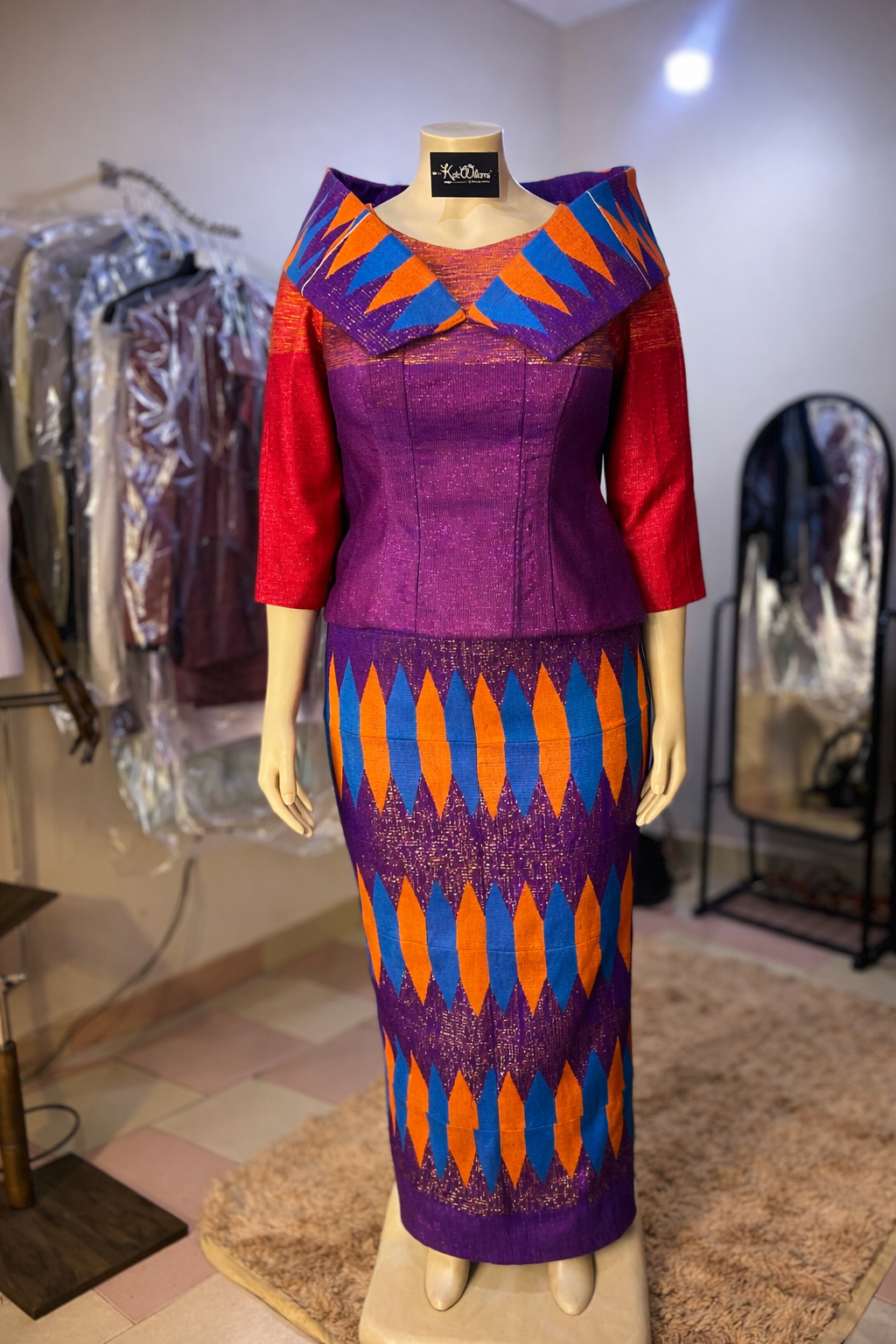 This Kente dress features a fitted bodice with structured seams, a high slit, and a flowing long skirt. The vibrant Kente patterns create a striking, elegant look, perfect for standing out at any event.